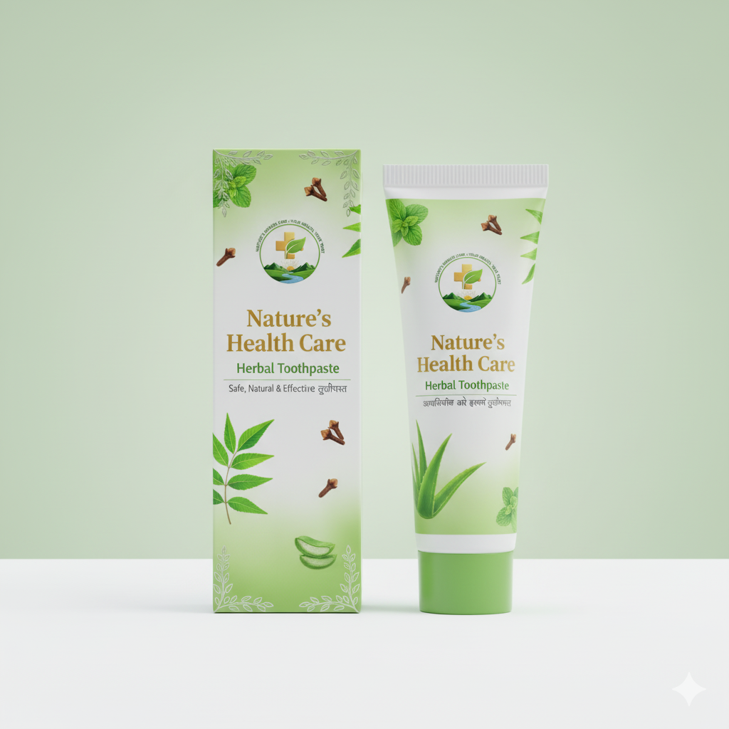 Nature’s Health Care Herbal Toothpaste is a 100% Ayurvedic formulation enriched with the goodness of Neem, Clove, Aloe Vera, Pudina, and Babool — trusted ingredients for complete oral care.